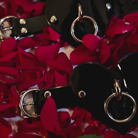 Unleash your wild side with the Black Heart Cuffs! These striking, soft vinyl cuffs feature a bold heart design and stainless steel O Ring, secured by stainless steel rivets and buckles. Perfect for those who dare to explore new depths of adventure, Embrace the thrill!
