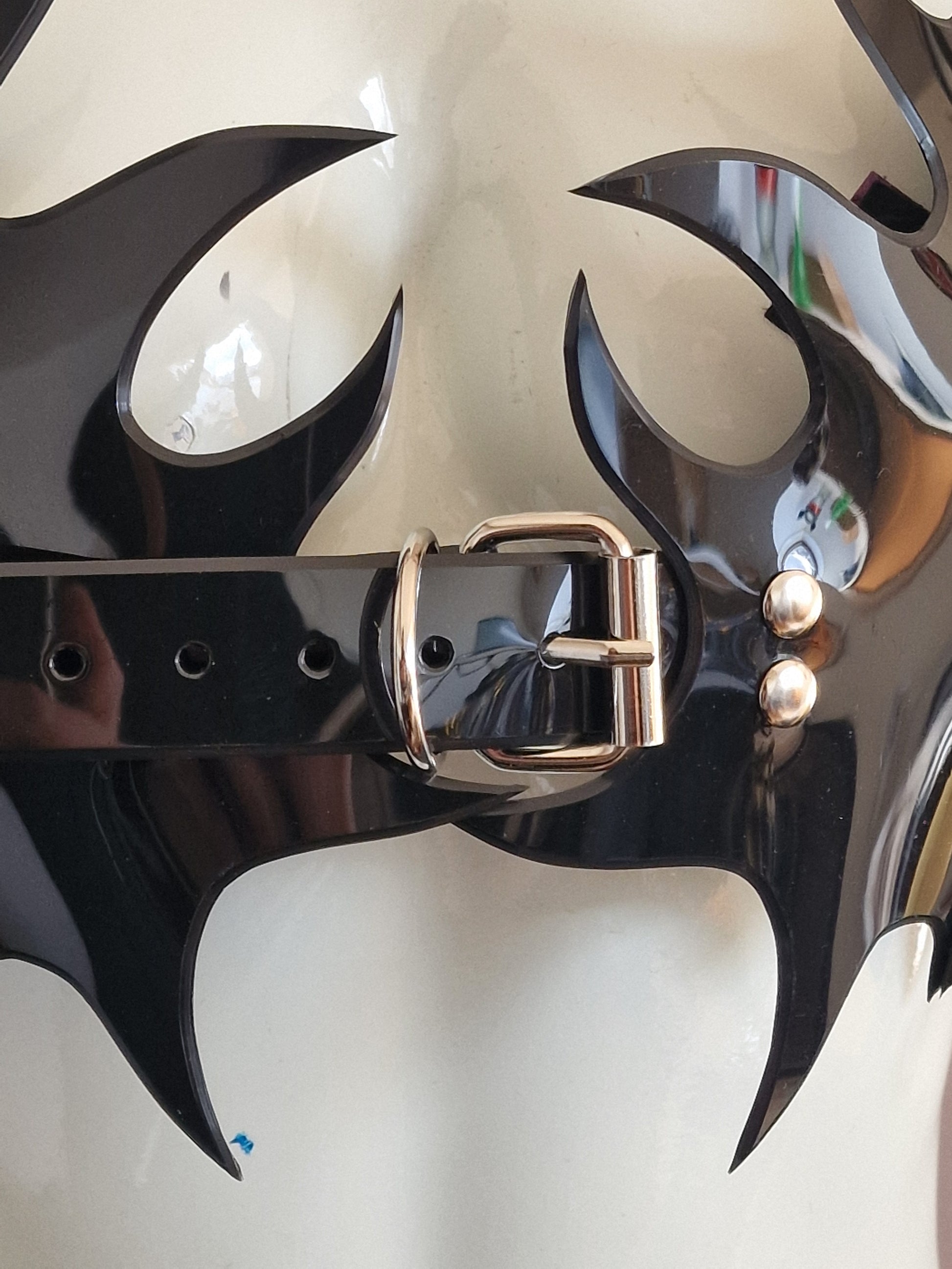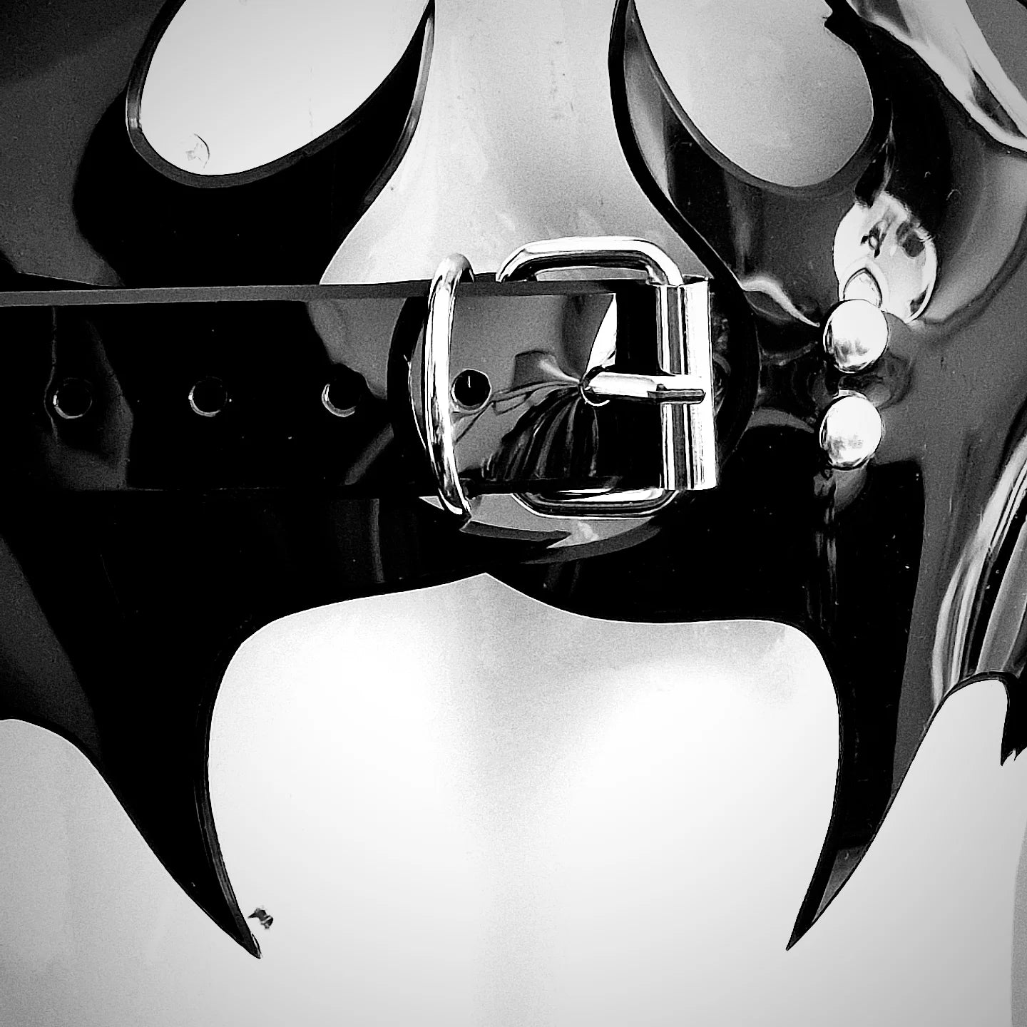 This Spiked Xen Bra features a sleek, black shiny vinyl design with unique spiked detailing.